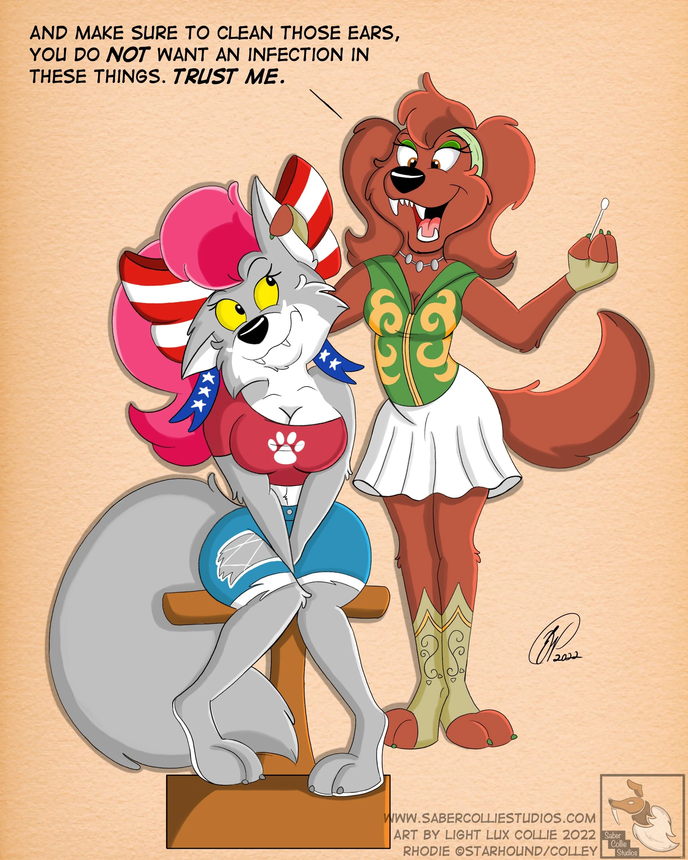 The first image I have here is a commission I did for the ever amazing Starhound. It features their character Rhodie giving some friendly grooming tips to Faye. Fortunately for Faye, Rhodie is a veteran when it comes to living life as a transformed, gender bent, former human. So she definitely has some seasoned advice for our heroine.