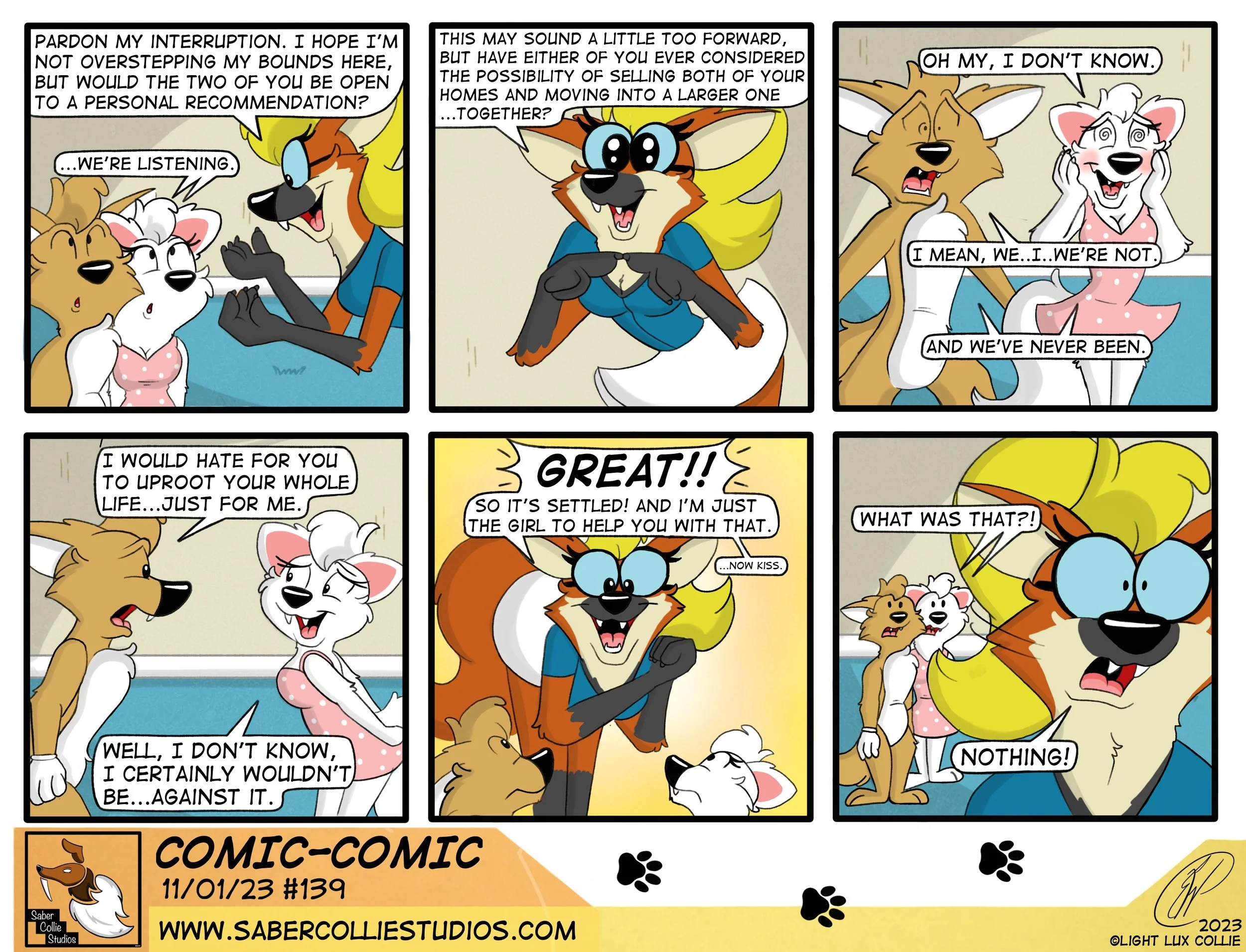 Home of the webcomics Denatured, Comic-Comic and Walk With Me. Saber Collie Studios is an online cartoon art studio individually owned and operated by cartoonist and animator Light Lux Collie.