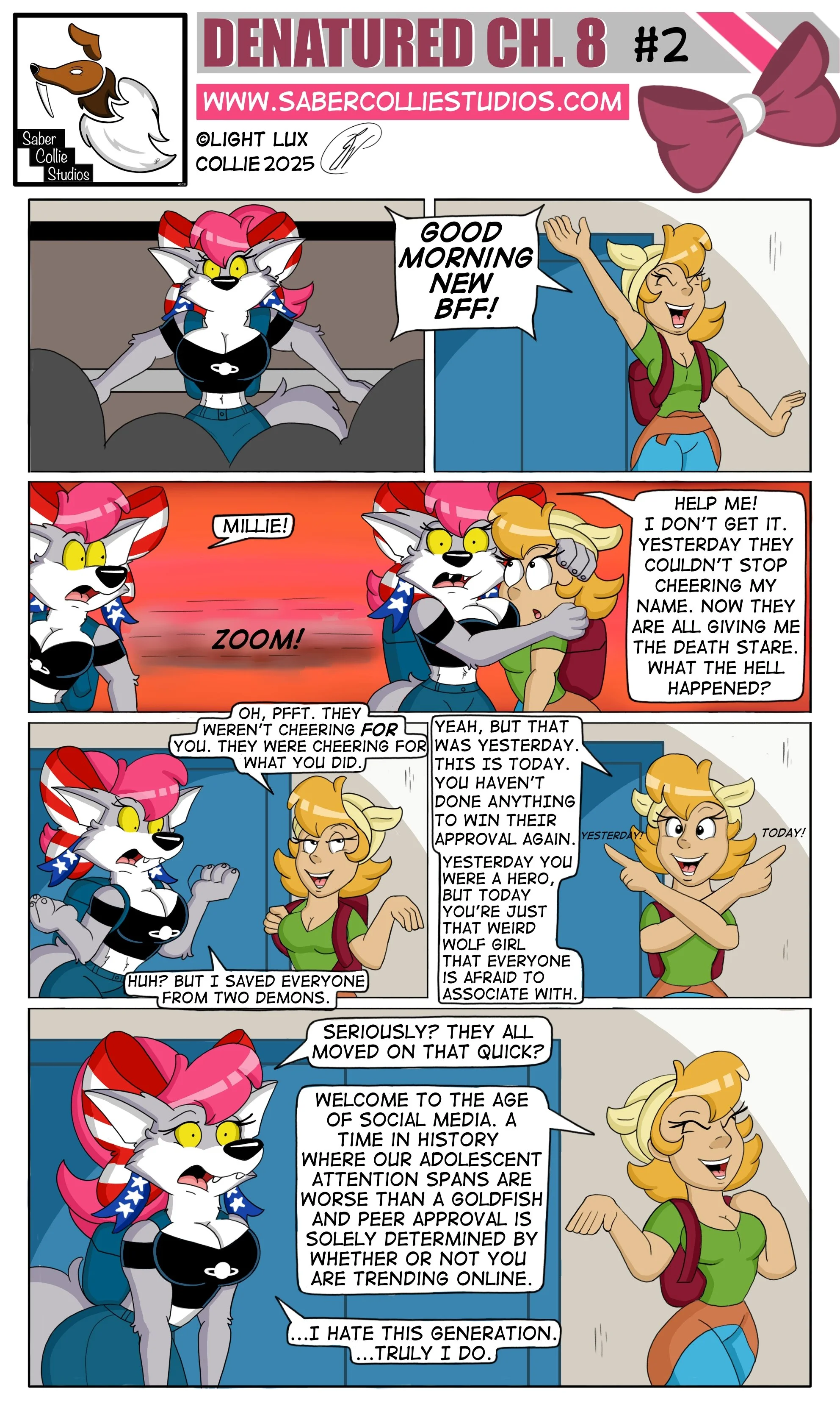 Home of the webcomics Denatured, Comic-Comic and Walk With Me. Saber Collie Studios is an online cartoon art studio individually owned and operated by cartoonist and animator Light Lux Collie.